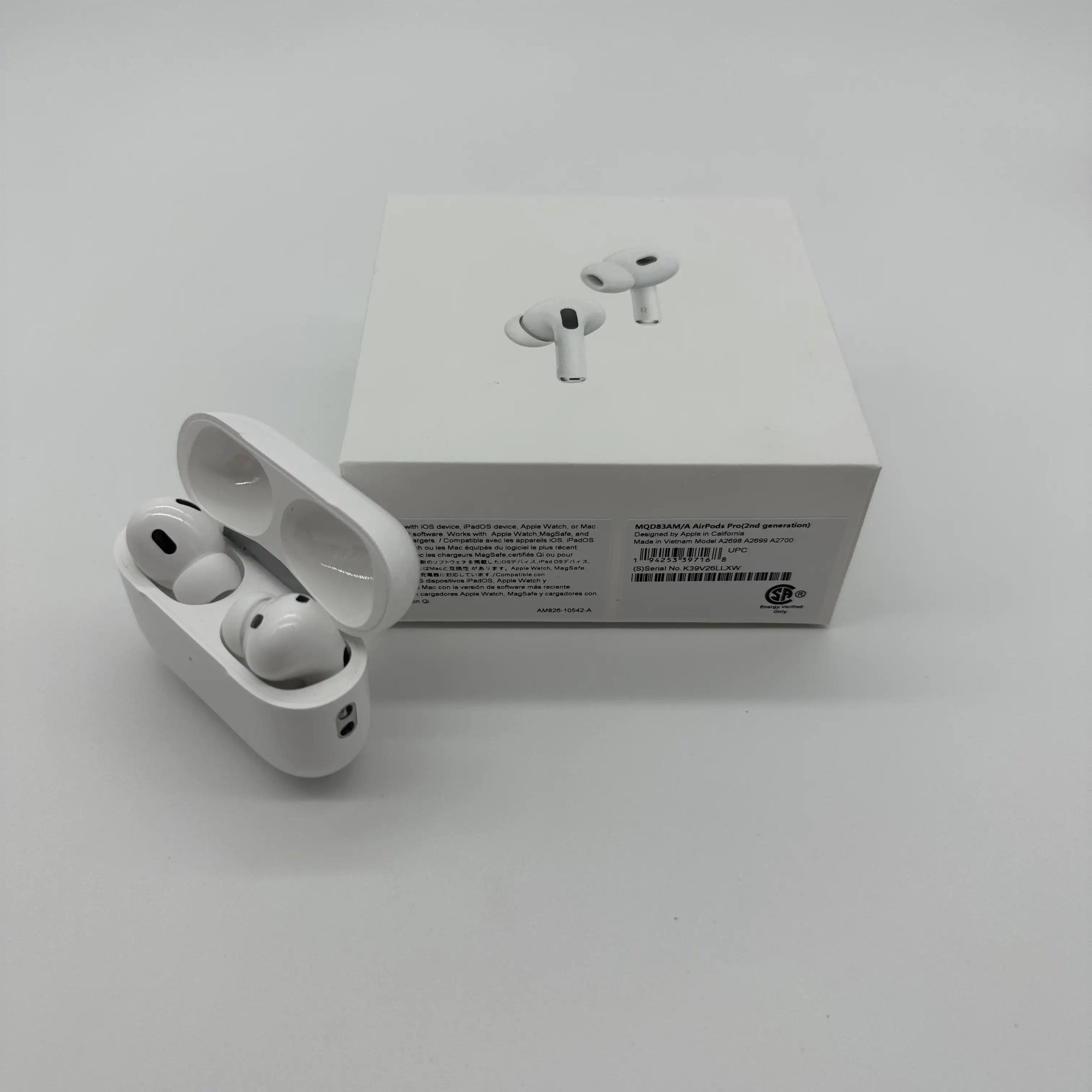 Our packaging uses high -quality paper materials, which is no different from the official original.The packaging for Apple AirPods Pro(2nd Generation) is sleek and compact. It consists of a small, rectangular box made of sturdy white cardboard. The front of the box features a picture of the AirPods Pro 2, while the back displays some technical specifications and information about the product. The box opens easily by sliding off the outer sleeve, revealing the new AirPods Pro nestled inside a molded plastic tray. Underneath the tray, there is a small compartment containing the charging cable and additional ear tips.